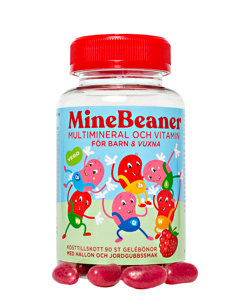 MineBeaner är ett kosttillskott i form av goda tuggisar med 15 olika mineraler och vitaminer. Innehåller vitamin A, vitamin D, vitamin E, vitamin C, vitamin B3, vitamin B6, vitamin B12, folsyra, biotin, magnesium, jod, zink, selen, krom och koppar. Med god jordgubbssmak. Kan tas av vuxna och barn från 3 år.