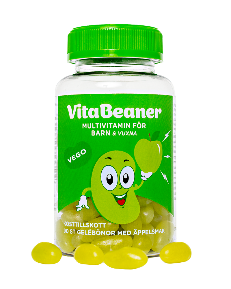 Gör den dagliga vitaminrutinen till dagens höjdpunkt! VitaBeaner Äpple är den smarta multivitaminen i form av goda, mjuka gelébönor med en fräsch smak av äpple. De är så goda att det känns som lördagsgodis – men är proppfulla med viktiga vitaminer för att stötta växande barn.